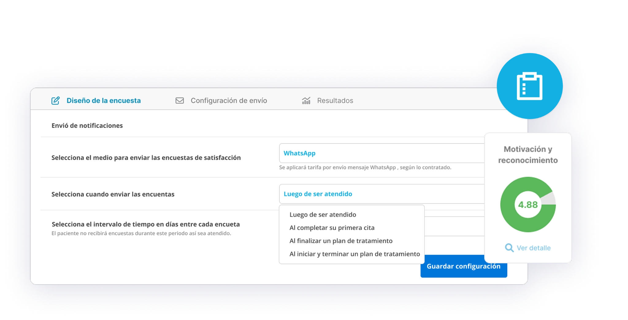 Agiliza la obtención de retroalimentación con envíos automatizados. Establece el período de tiempo y configura distintas opciones fácilmente en Medilink, asegurando una comunicación constante sin mayores esfuerzos.