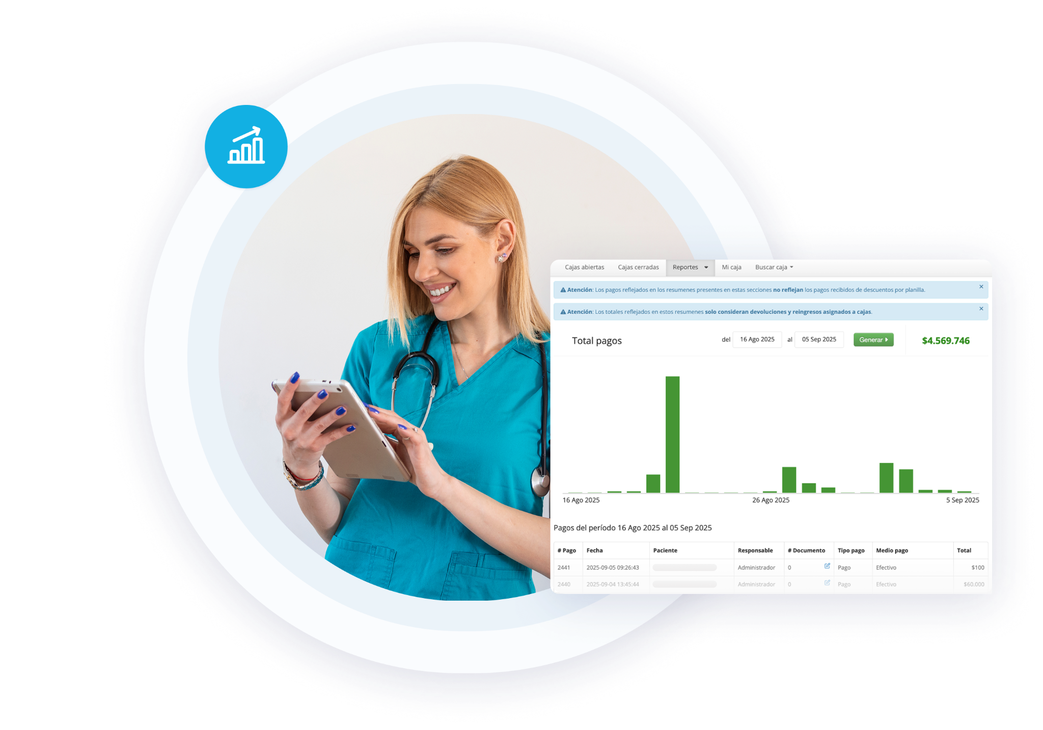 Analiza los movimientos de dinero por medio de pago (efectivo, transferencia, tarjeta) o por caja, ideal para clínicas con múltiples sucursales o puntos de recaudación.